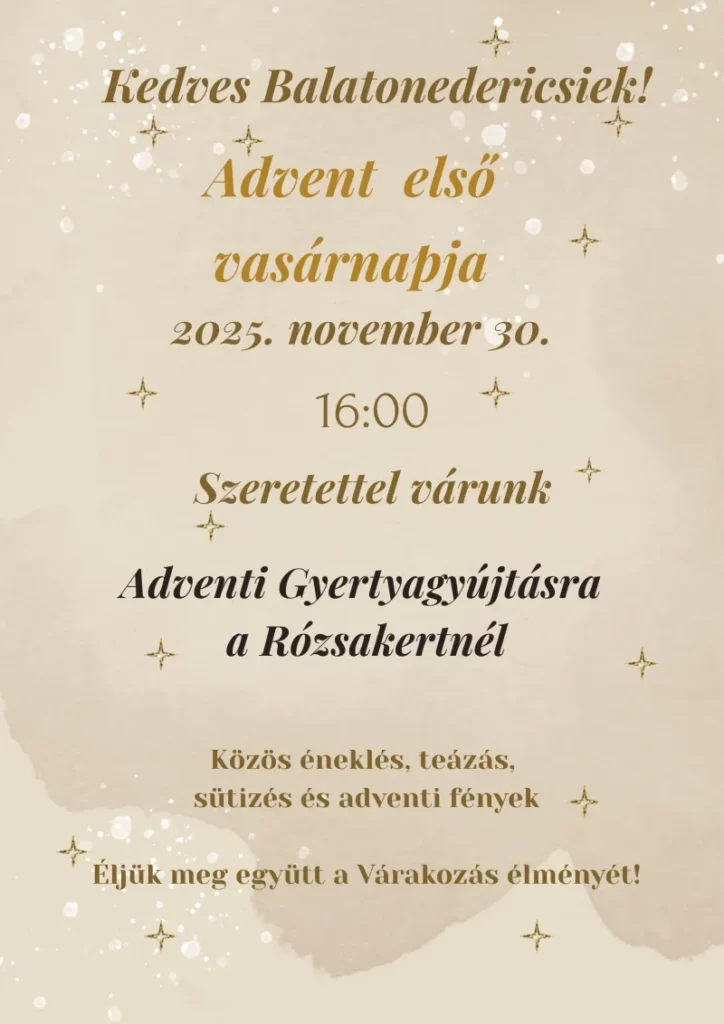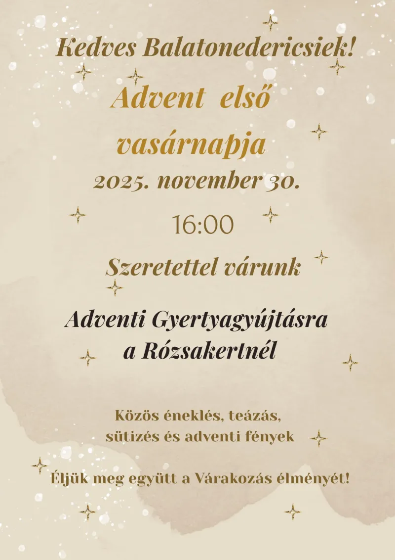 Adventi gyertyagyújtás 2025 Adventi gyertyagyújtás 2025. évben is Balatonedericsen az autóbusz fordulónál lévő Rózsakertnél: + Google Naptárba mentés + iCal / Outlook exportálás Dátum 2025 nov 30 Idő 16:30 - 17:00 Kategória Ünnepi megemlékezés Szervező Kajtár Annamária közművelődési referens Telefon +36 70 320 2148 Email bekonyvtar@gmail.com Esemény megosztása