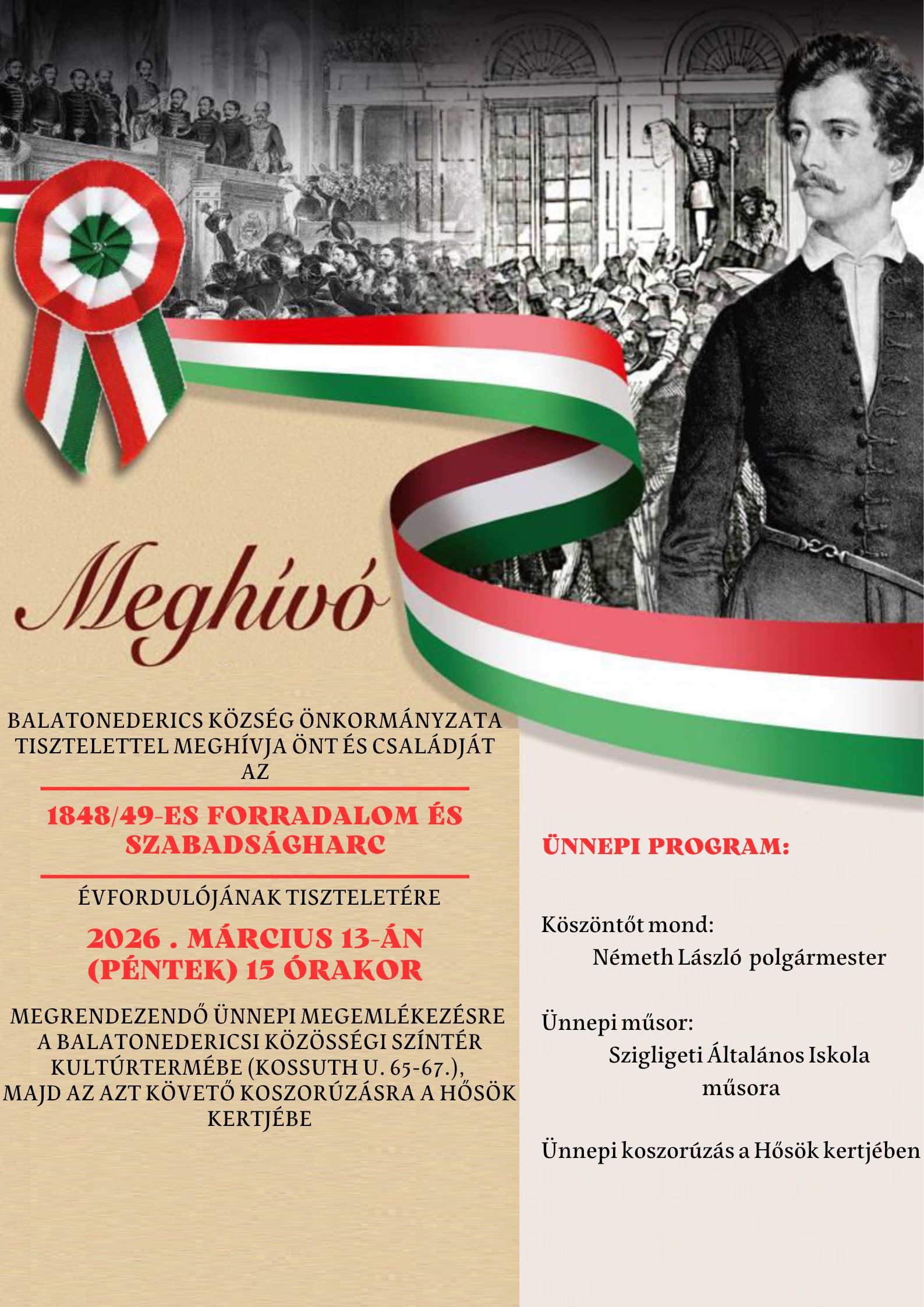 Megemlékezés március 15. alkalmából Ünnepi koszorúzás a Hősök Kertjében. + Google Naptárba mentés + iCal / Outlook exportálás Dátum 2026 márc 13 Idő 15:00 - 16:00 Helyszín Balatonederics Hősök kertje Balatonederics, Kossuth utca 84. Esemény megosztása
