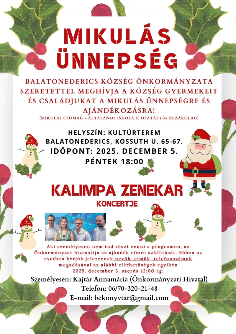 Balatonederics Község Önkormányzata szeretettel meghívja a község gyermekeit és családjukat a községi mikulás ünnepségre és ajándékozásra!