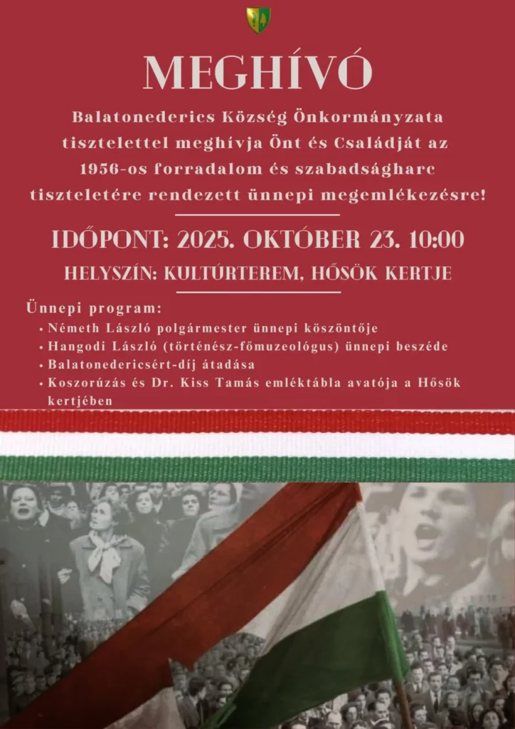 Október 23-i ünnepség 2025 Balatonederics Község Önkormányzata tisztelettel meghívja Önt, az 1956-os forradalom és szabadságharc tiszteletére rendezett ünnepi megemlékezésre! Időpont: 2025. október 23. 10:00 Helyszín: Művelődési Ház, Hősök kertje Ünnepi program a plakáton: + Google Naptárba mentés + iCal / Outlook exportálás Dátum 2025 okt 23 Idő 10:00 - 11:00 Helyszín Balatonederics Művelődési Ház Balatonederics, Kossuth utca 67. Honlap https://www.facebook.com/kulturhaz.hu Más helyek Balatonederics Hősök kertje Balatonederics, Kossuth utca 84. Kategória Ünnepi megemlékezés Szervező Kajtár Annamária közművelődési referens Telefon +36 70 320 2148 Email bekonyvtar@gmail.com Esemény megosztása