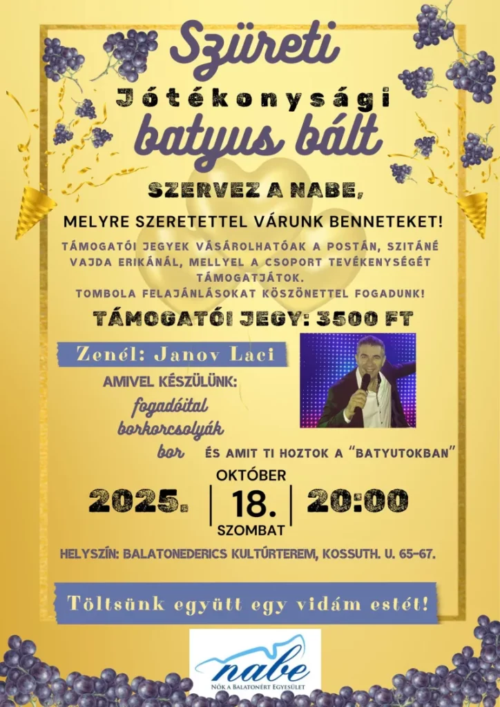 Szüreti batyus bál 2025 Jótékonysági batyus bált szervez a NABE, melyre szeretettel várjuk a község lakóit, ismerőseit. Részletek a plakáton: + Google Naptárba mentés + iCal / Outlook exportálás Dátum 2025 okt 18 Idő Egész nap Költség 3.500 Ft Helyszín Balatonederics Művelődési Ház Balatonederics, Kossuth utca 67. Honlap https://www.facebook.com/kulturhaz.hu Kategória Bál NABE. rendezvény Szervező NABE. balatonedericsi csoport Telefon +36 30 346 8362 Email marianna0804@freemail.hu Esemény megosztása